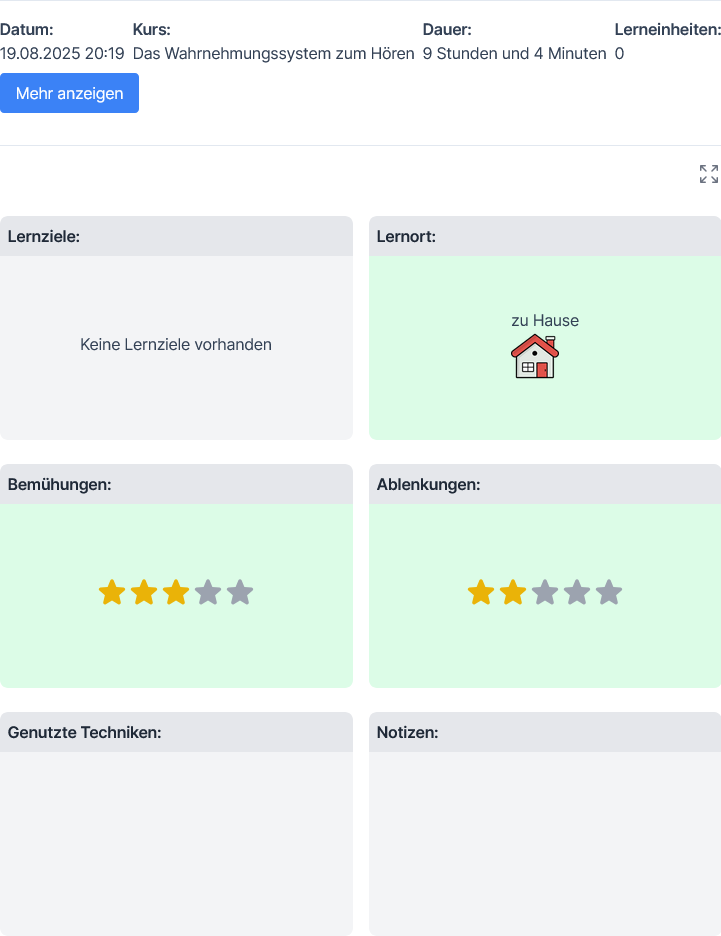 Unterhalb der automatisch erfassten Informationen befinden sich die Felder, die von den Lernenden selbst ausgefüllt werden. Hierzu gehören Lernziele, Bemühungen, genutzte Techniken, Lernort, Ablenkungen und Notizen. Zwischen einer kompakten und einer detaillierten Darstellung kann jederzeit gewechselt werden. In der detaillierten Ansicht erscheinen zu jedem Feld kurze Beschreibungen, die den Zweck der Eingabe verdeutlichen.